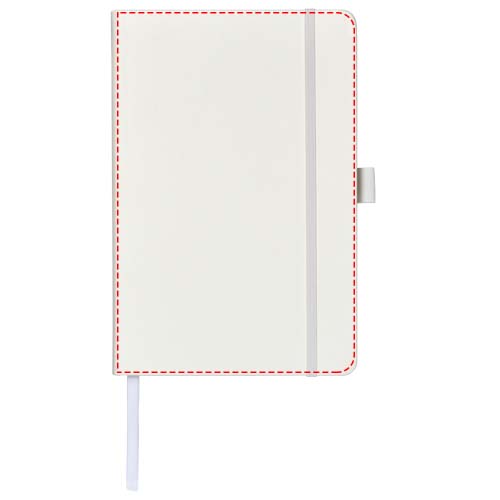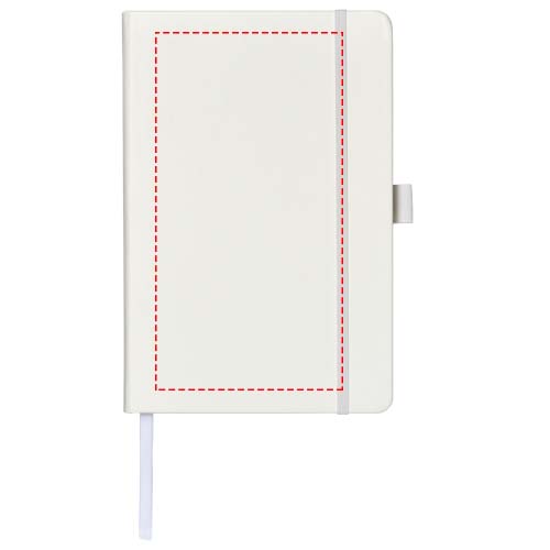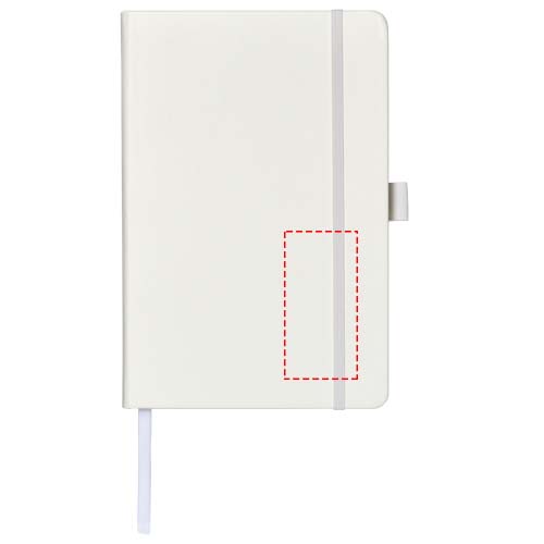Kunstleder-A5-Notizbuch (14,2 x 21,4 cm, Lederimitat) mit Gummiband, Farbband, Stiftschlaufe und Akkordeon-Tasche an der Rückseite. Enthält 96 Blätter cremefarbenes Papier in 80 g/m2 und wird in einem Journalbook mit weißer Hülle angeboten.